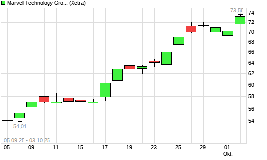 Mit dem Anstieg auf 74,00 EUR hat die Marvell Technlogy Group-Aktie (ISIN US5738741041) am 02.10.2025 ein neues 6-Monats-Hoch erreicht und damit den Kurs vom 25.09.2025 eingestellt.Die Marvell ...weiterlesen