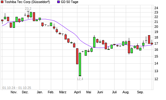 Mit dem Anstieg auf 17,00 EUR hat die Toshiba Tec-Aktie am 30.09.2025 die 50-Tage-Linie nach oben gekreuzt.Die Toshiba Tec-Aktie befindet sich seit dem 24.09.2025 im langfristigen Abwärtstrend ...weiterlesen
