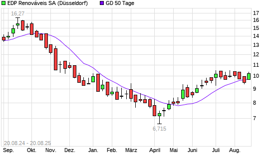 Mit dem Anstieg auf 10,32 EUR hat die EDP Renováveis-Aktie am 19.08.2025 die 50-Tage-Linie nach oben gekreuzt.Die EDP Renováveis-Aktie befindet sich seit dem 02.07.2025 im langfristigen ...weiterlesen