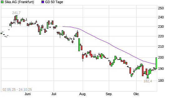 Mit dem Anstieg auf 200,00 EUR hat die Sika-Aktie am 23.10.2025 die 50-Tage-Linie nach oben gekreuzt.Die Sika-Aktie befindet sich seit dem 15.10.2024 im langfristigen Abwärtstrend und hat in ...weiterlesen