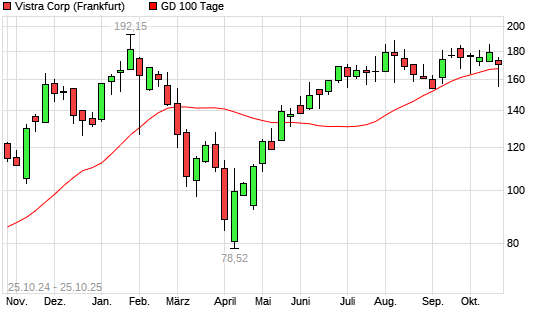 Mit dem Anstieg auf 170,00 EUR hat die Vistra Energy-Aktie am 24.10.2025 die 100-Tage-Linie nach oben gekreuzt.Die Vistra Energy-Aktie befindet sich seit dem 12.05.2025 im langfristigen Aufwärtstrend ...weiterlesen