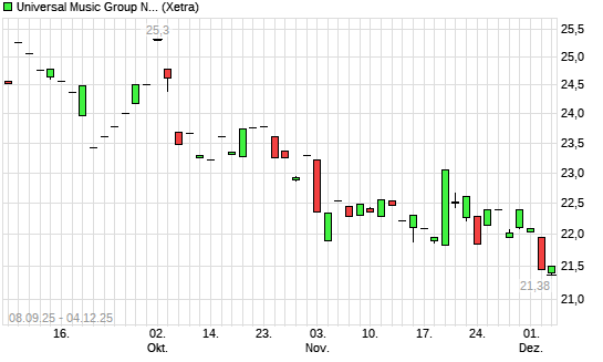 Mit dem Rücksetzer auf 21,32 EUR hat die Universal Music Group-Aktie (ISIN NL0015000IY2) am 03.12.2025 ein neues 12-Monats-Tief erreicht und damit den Kurs vom 02.12.2025 eingestellt.Die ...weiterlesen