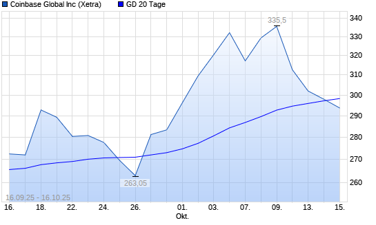 Mit dem Rücksetzer auf 290,45 EUR hat die Coinbase-Aktie am 15.10.2025 die 20-Tage-Linie nach unten gekreuzt.Die Coinbase-Aktie befindet sich seit dem 16.06.2025 im langfristigen Aufwärtstrend ...weiterlesen