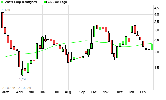 Mit dem Anstieg auf 2,50 EUR hat die VUZIX CORP. NEW-Aktie am 20.02.2026 die 200-Tage-Linie nach oben gekreuzt.Die VUZIX CORP. NEW-Aktie befand sich seit dem 05.02.2026 im ...weiterlesen