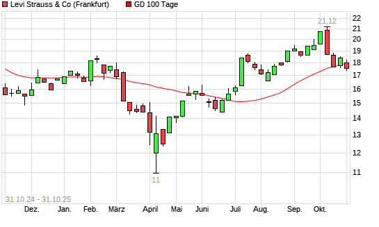 Mit dem Rücksetzer auf 17,40 EUR hat die Levi Strauss & Co-Aktie am 30.10.2025 die 100-Tage-Linie nach unten gekreuzt.Die Levi Strauss & Co-Aktie befindet sich seit dem 02.07.2025 im ...weiterlesen