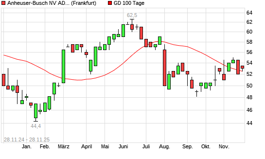 Mit dem Rücksetzer auf 52,50 EUR hat die Anheuser-Busch InBev ADR-Aktie am 27.11.2025 die 100-Tage-Linie nach unten gekreuzt.Die Anheuser-Busch InBev ADR-Aktie befindet sich seit dem 13.11.2025 ...weiterlesen