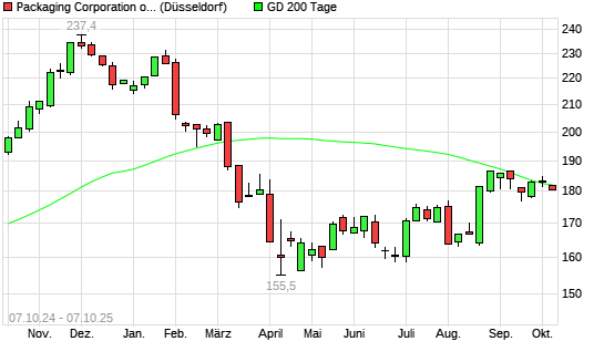 Mit dem Rücksetzer auf 181,65 EUR hat die Packaging Corp of America-Aktie am 06.10.2025 die 200-Tage-Linie nach unten gekreuzt.Die Packaging Corp of America-Aktie befand sich seit dem 26.09.2025 ...weiterlesen