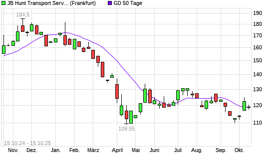 Mit dem Anstieg auf 120,35 EUR hat die JB Hunt Transport Services-Aktie am 14.10.2025 die 50-Tage-Linie nach oben gekreuzt.Die JB Hunt Transport Services-Aktie befindet sich seit dem 24.02.2025 ...weiterlesen