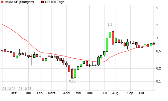 Mit dem Anstieg auf 0,80 EUR hat die Nakiki SE-Aktie am 27.10.2025 die 100-Tage-Linie nach oben gekreuzt.Die Nakiki SE-Aktie befindet sich seit dem 30.06.2025 im langfristigen Aufwärtstrend ...weiterlesen