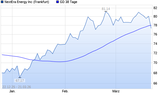 Mit dem Rücksetzer auf 77,35 EUR hat die NextEra Energy-Aktie am 20.03.2026 die 38-Tage-Linie nach unten gekreuzt.Die NextEra Energy-Aktie befindet sich seit dem 25.09.2025 ...weiterlesen