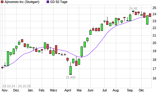 Mit dem Anstieg auf 23,63 EUR hat die Ajinomoto-Aktie am 23.10.2025 die 50-Tage-Linie nach oben gekreuzt.Die Ajinomoto-Aktie befindet sich seit dem 08.05.2025 im langfristigen Aufwärtstrend ...weiterlesen