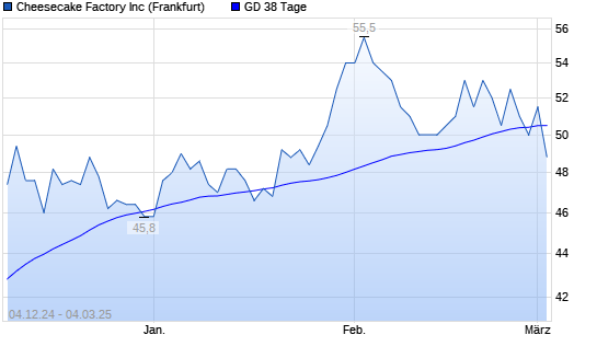 Mit dem Anstieg auf 51,50 EUR hat die The Cheesecake Factory-Aktie am 03.03.2025 die 38-Tage-Linie nach oben gekreuzt.Die The Cheesecake Factory-Aktie befindet sich seit dem 16.09.2024 im langfristigen ...weiterlesen