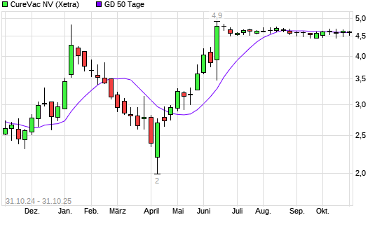 Mit dem Rücksetzer auf 4,57 EUR hat die CureVac-Aktie am 30.10.2025 die 50-Tage-Linie nach unten gekreuzt.Die CureVac-Aktie befindet sich seit dem 28.04.2025 im langfristigen Aufwärtstrend ...weiterlesen