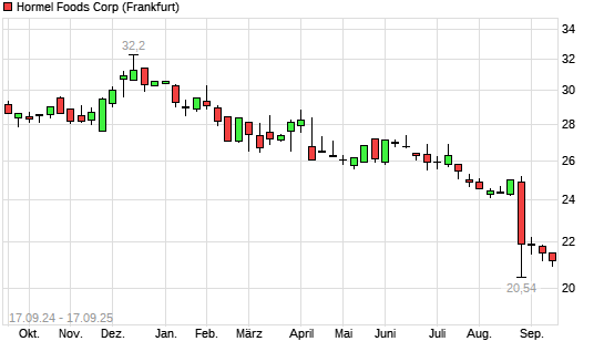 Mit dem Rücksetzer auf 21,06 EUR hat die Hormel Foods-Aktie (ISIN US4404521001) am 16.09.2025 ein neues 10-Jahres-Tief erreicht und damit den Kurs vom 15.09.2025 eingestellt.Die Hormel ...weiterlesen