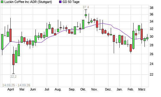 Mit dem Anstieg auf 29,80 EUR hat die Luckin Coffee ADR-Aktie am 13.03.2026 die 50-Tage-Linie nach oben gekreuzt.Die Luckin Coffee ADR-Aktie befindet sich seit dem 25.02.2026 ...weiterlesen