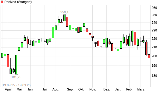 Mit dem Rücksetzer auf 200,60 EUR hat die Resmed-Aktie (ISIN US7611521078) am 18.03.2026 ein neues 6-Monats-Tief erreicht und damit den Kurs vom 17.03.2026 ...weiterlesen