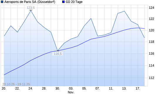 Mit dem Rücksetzer auf 118,90 EUR hat die Aeroports de Paris-Aktie am 18.11.2025 die 20-Tage-Linie nach unten gekreuzt.Die Aeroports de Paris-Aktie befindet sich seit dem 04.08.2025 im ...weiterlesen