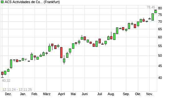 Mit dem Anstieg auf 78,45 EUR hat die ACS Actividades de Construccion y Servicios SA-Aktie (ISIN ES0167050915) am 11.11.2025 ein neues All-Time-High erreicht und damit den Kurs vom 10.11.2025 ...weiterlesen