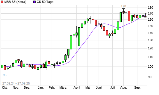 Mit dem Rücksetzer auf 164,60 EUR hat die MBB-Aktie am 26.09.2025 die 50-Tage-Linie nach unten gekreuzt.Die MBB-Aktie befindet sich seit dem 25.02.2025 im langfristigen Aufwärtstrend und ...weiterlesen