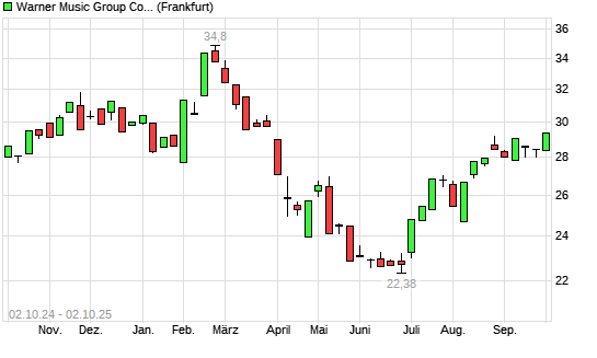 Mit dem Anstieg auf 29,19 EUR hat die Warner Music Group-Aktie (ISIN US9345502036) am 01.10.2025 ein neues 6-Monats-Hoch erreicht und damit den Kurs vom 26.08.2025 eingestellt.Die Warner Music ...weiterlesen