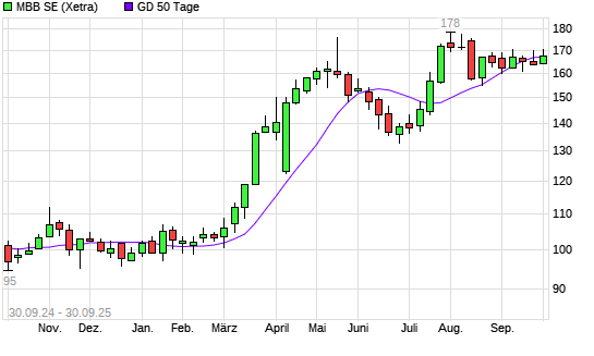 Mit dem Anstieg auf 166,80 EUR hat die MBB-Aktie am 29.09.2025 die 50-Tage-Linie nach oben gekreuzt.Die MBB-Aktie befindet sich seit dem 25.02.2025 im langfristigen Aufwärtstrend und hat in ...weiterlesen