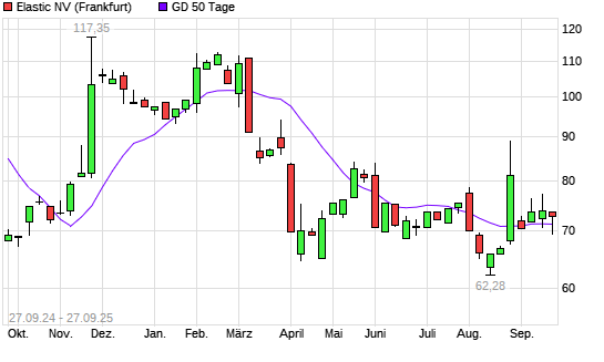 Mit dem Anstieg auf 72,60 EUR hat die Elastic-Aktie am 26.09.2025 die 50-Tage-Linie nach oben gekreuzt.Die Elastic-Aktie befindet sich seit dem 27.03.2025 im langfristigen Abwärtstrend und hat ...weiterlesen