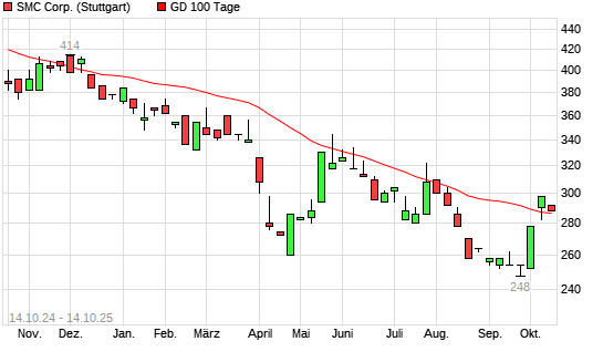 Mit dem Rücksetzer auf 286,00 EUR hat die SMC-Aktie am 13.10.2025 die 100-Tage-Linie nach unten gekreuzt.Der Abstand zur 200-Tage-Linie beträgt aktuell -7,42%. ...weiterlesen