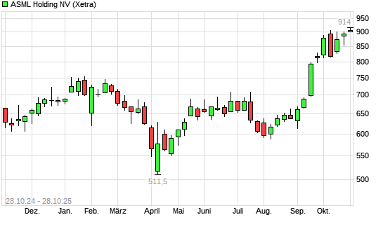 Mit dem Anstieg auf 910,60 EUR hat die ASML Holding-Aktie (ISIN NL0010273215) am 27.10.2025 ein neues 12-Monats-Hoch erreicht und damit den Kurs vom 20.10.2025 eingestellt.Die ASML Holding-Aktie ...weiterlesen