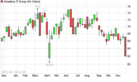 Mit dem Rücksetzer auf 62,62 EUR hat die Amadeus IT-Aktie (ISIN ES0109067019) am 19.11.2025 ein neues 12-Monats-Tief erreicht und damit den Kurs vom 07.04.2025 eingestellt.Die Amadeus IT-Aktie ...weiterlesen