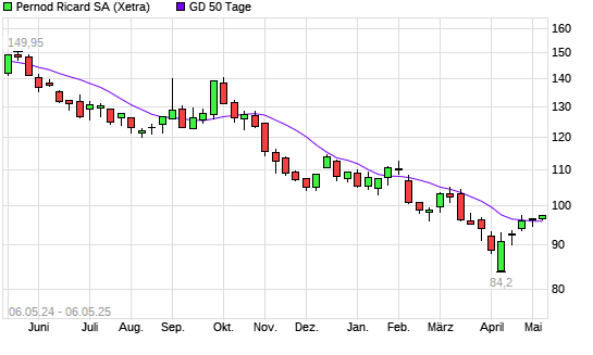 Mit dem Anstieg auf 96,04 EUR hat die Pernod Ricard-Aktie am 05.05.2025 die 50-Tage-Linie nach oben gekreuzt.Die Pernod Ricard-Aktie befindet sich seit dem 14.08.2023 im langfristigen Abwärtstrend ...weiterlesen