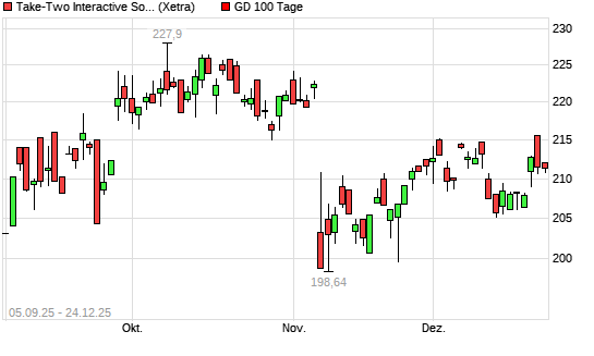 Mit dem Rücksetzer auf 209,15 EUR hat die Take 2 Interactive-Aktie am 23.12.2025 die 100-Tage-Linie nach unten gekreuzt.Die Take 2 Interactive-Aktie befindet sich seit dem 19.11.2025 im ...weiterlesen