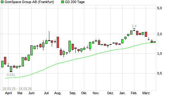 Mit dem Anstieg auf 1,49 EUR hat die GomSpace Group-Aktie am 17.03.2026 die 200-Tage-Linie nach oben gekreuzt.Die GomSpace Group-Aktie befand sich seit dem 13.03.2026 im ...weiterlesen