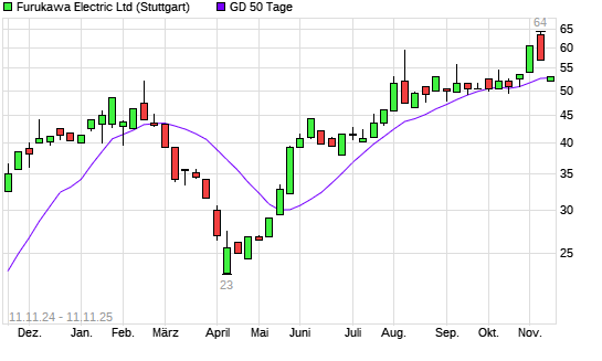 Mit dem Rücksetzer auf 52,50 EUR hat die Furukawa Electric-Aktie am 10.11.2025 die 50-Tage-Linie nach unten gekreuzt.Die Furukawa Electric-Aktie befindet sich seit dem 13.05.2025 im langfristigen ...weiterlesen