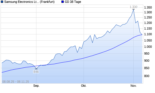 Mit dem Rücksetzer auf 1.096,00 EUR hat die Samsung-Aktie am 07.11.2025 die 38-Tage-Linie nach unten gekreuzt.Die Samsung-Aktie befindet sich seit dem 24.06.2025 im langfristigen Aufwärtstrend ...weiterlesen