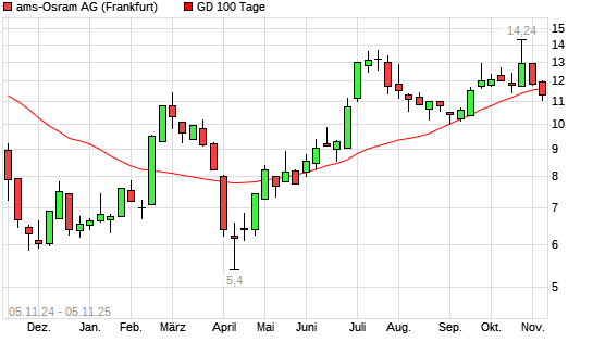 Mit dem Rücksetzer auf 11,26 EUR hat die AMS-Aktie am 04.11.2025 die 100-Tage-Linie nach unten gekreuzt.Die AMS-Aktie befindet sich seit dem 04.06.2025 im langfristigen Aufwärtstrend und ...weiterlesen