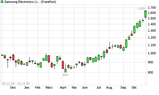 Mit dem Anstieg auf 1.630,00 EUR hat die Samsung Electronics St GDR-Aktie (ISIN US7960508882) am 31.10.2025 ein neues 3-Jahres-Hoch erreicht und damit den Kurs vom 30.10.2025 eingestellt.Die ...weiterlesen