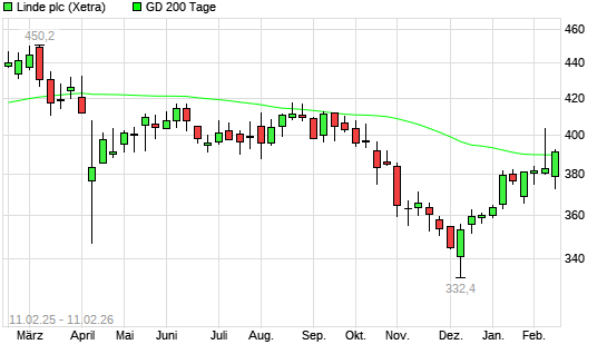 Mit dem Anstieg auf 389,00 EUR hat die Linde PLC-Aktie am 10.02.2026 die 200-Tage-Linie nach oben gekreuzt.Die Linde PLC-Aktie befand sich seit dem 06.02.2026 im ...weiterlesen