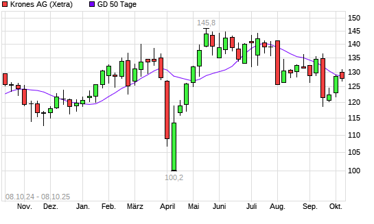 Mit dem Rücksetzer auf 128,20 EUR hat die Krones-Aktie am 07.10.2025 die 50-Tage-Linie nach unten gekreuzt.Die Krones-Aktie befindet sich seit dem 17.09.2025 im langfristigen Abwärtstrend ...weiterlesen