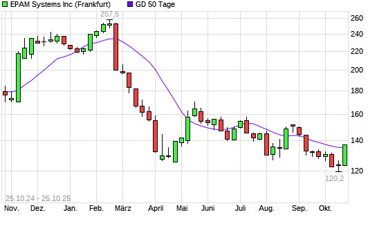 Mit dem Anstieg auf 137,25 EUR hat die EPAM Systems-Aktie am 24.10.2025 die 50-Tage-Linie nach oben gekreuzt.Die EPAM Systems-Aktie befindet sich seit dem 28.02.2025 im langfristigen Abwärtstrend ...weiterlesen
