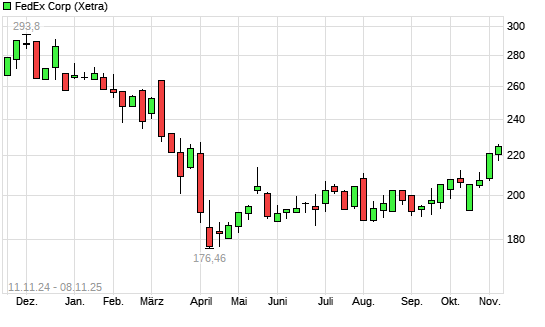 Mit dem Anstieg auf 224,20 EUR hat die FedEx-Aktie (ISIN US31428X1063) am 07.11.2025 ein neues 6-Monats-Hoch erreicht und damit den Kurs vom 06.11.2025 eingestellt.Die FedEx-Aktie befindet sich ...weiterlesen