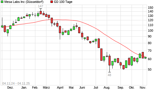 Mit dem Rücksetzer auf 61,50 EUR hat die Mesa Laboratories-Aktie am 03.11.2025 die 100-Tage-Linie nach unten gekreuzt.Die Mesa Laboratories-Aktie befindet sich seit dem 27.03.2025 im langfristigen ...weiterlesen