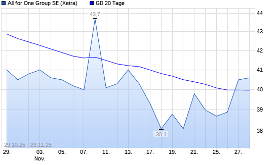 Mit dem Anstieg auf 39,90 EUR hat die All for One Group-Aktie am 28.11.2025 die 20-Tage-Linie nach oben gekreuzt.Die All for One Group-Aktie befindet sich seit dem 02.07.2025 im langfristigen ...weiterlesen