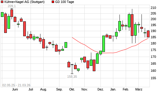 Mit dem Rücksetzer auf 183,05 EUR hat die Kühne + Nagel-Aktie am 20.03.2026 die 100-Tage-Linie nach unten gekreuzt.Die Kühne + Nagel-Aktie befindet sich seit dem 17.02.2026 ...weiterlesen