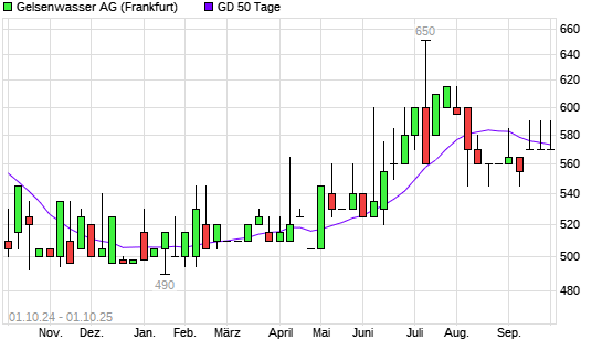 Mit dem Anstieg auf 590,00 EUR hat die Gelsenwasser-Aktie am 30.09.2025 die 50-Tage-Linie nach oben gekreuzt.Die Gelsenwasser-Aktie befindet sich seit dem 02.05.2025 im langfristigen Aufwärtstrend ...weiterlesen