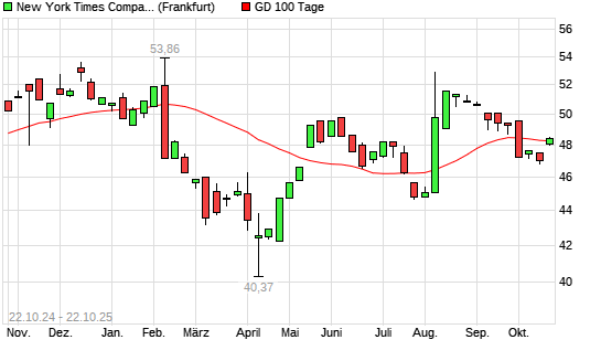 Mit dem Anstieg auf 48,50 EUR hat die New York Times Company-Aktie am 21.10.2025 die 100-Tage-Linie nach oben gekreuzt.Die New York Times Company-Aktie befindet sich seit dem 20.10.2025 im langfristigen ...weiterlesen