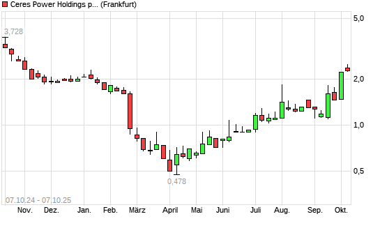 Mit dem Anstieg auf 2,25 EUR hat die Ceres Power-Aktie (ISIN GB00BG5KQW09) am 06.10.2025 ein neues 6-Monats-Hoch erreicht und damit den Kurs vom 03.10.2025 eingestellt.Die Ceres Power-Aktie ...weiterlesen