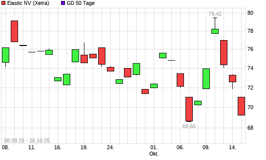 Mit dem Rücksetzer auf 70,12 EUR hat die Elastic-Aktie am 15.10.2025 die 50-Tage-Linie nach unten gekreuzt.Die Elastic-Aktie befindet sich seit dem 27.03.2025 im langfristigen Abwärtstrend ...weiterlesen