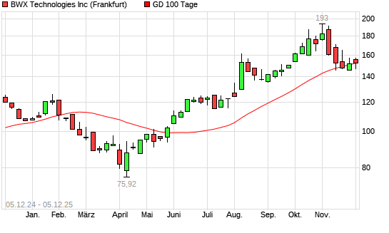 Mit dem Anstieg auf 157,35 EUR hat die BWX Technologies-Aktie am 04.12.2025 die 100-Tage-Linie nach oben gekreuzt.Die BWX Technologies-Aktie befindet sich seit dem 26.05.2025 im langfristigen ...weiterlesen
