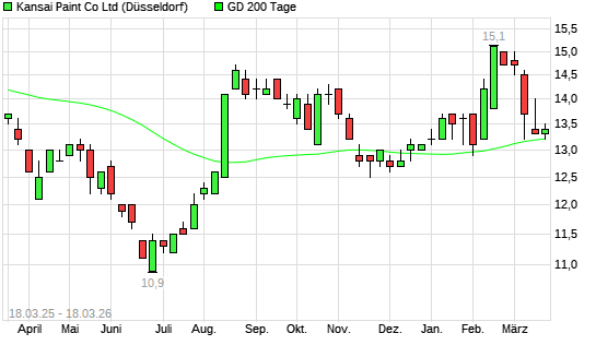 Mit dem Rücksetzer auf 13,30 EUR hat die Kansai Paint-Aktie am 17.03.2026 die 200-Tage-Linie nach unten gekreuzt.Die Kansai Paint-Aktie befand sich seit dem 19.12.2025 ...weiterlesen
