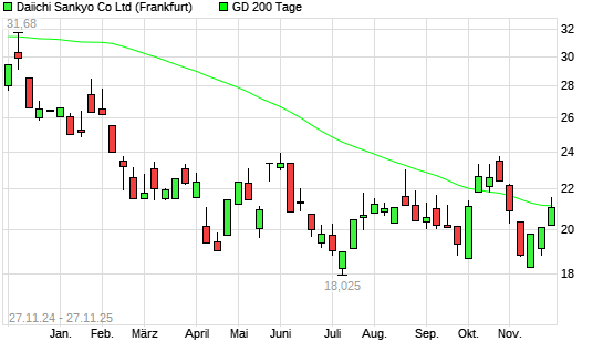 Mit dem Rücksetzer auf 21,03 EUR hat die Daiichi Sankyo-Aktie am 26.11.2025 die 200-Tage-Linie nach unten gekreuzt.Die Daiichi Sankyo-Aktie befand sich seit dem 25.11.2025 im langfristigen ...weiterlesen
